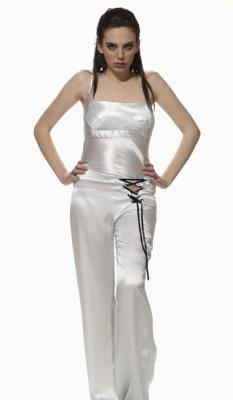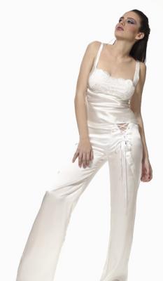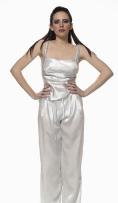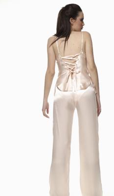 This glamorous and yet comfortable pajama top features a modern and classic structure in the front and a courageous dazzling dramatic back. The satin laced back adjusts easily to fit comfortably and can be worn seductively loose or sensually tight and snug. It is spiked with humor and wild individuality.